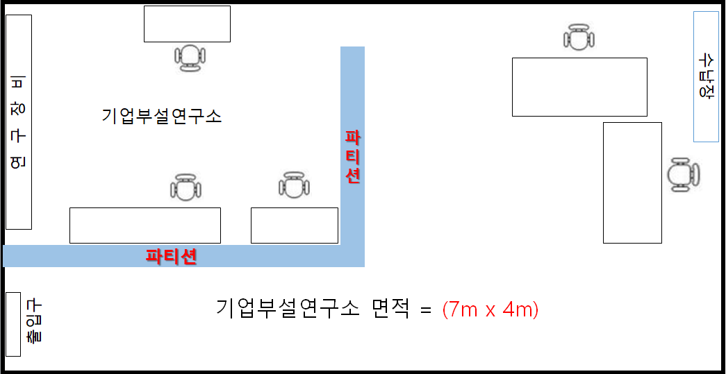 별도의 출입문 없이 파티션 만으로 기업부설연구소를 구성했습니다. 단 파티션 옆 통로에는 기업부설연구소 현판을 부착해야 합니다.