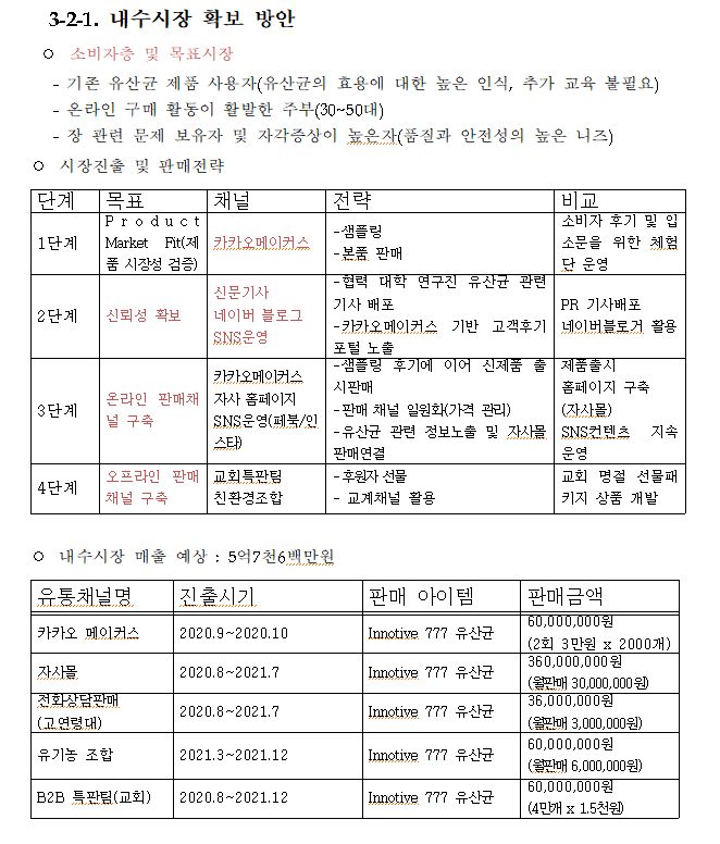저의 유산균 아이템으로 소비자층 및 목표시장을 기술했고, 단계별 판매전략도 짜봤습니다. 시장 진출 1단계로는 카카오메이커스를 통한 입소문을 위한 체험단 운영(샘플링), 2단계로는 신문기사, SNS, 블로그 운영을 통한 신뢰성 확보에 초점을 뒀고 3단계는 온라인 판매채널 구축(자사몰 구축), 4단계는 오프라인 채널도 구축하는 계획으로 세웠습니다.