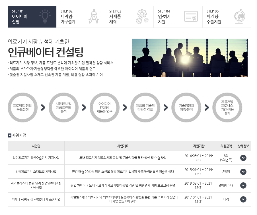 원주시에 위치하고 있습니다. 아래 주요 지원사업을 보시면 의료분야 창업 지원, 시제품 제작 및 디자인 설계 지원, 의료기가 인허가 등록 지원 업무를 수행중에 있습니다.