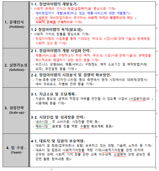 지난 달 공고된 예비창업패크지 일반분야 사업계획서와 특화분야 사업계획서는 목차와 작성 가이드라인이 똑같습니다. 단 특화분야 내 소셜벤처 분야(100명 모집) 사업계획서는 작성 가이드라인을 보시면 말그대로 사회적 기업(소셜벤처)의 정체성으로 인해 사회적 가치 및 사회적 문제 해결을 중점적으로 작성하셔야 합니다. 아래 소셜벤처 분야 사업계획서 양식 첫페이지에 있는 작성 가이드라인(빨간 글씨)을 참고하세요.