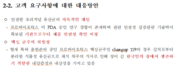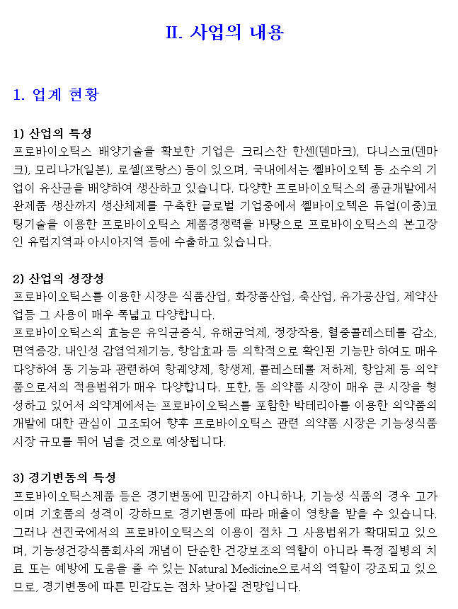 사업보고서 파일을 여셔서 특히 제2장 사업의 내용 부분을 보시면 아래와 같이 프로바이오틱스 산업의 특성, 성장성, 자