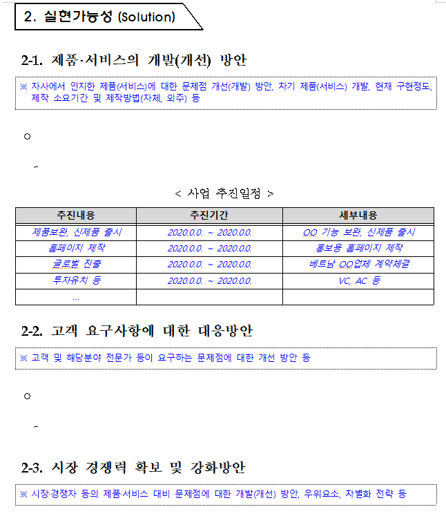 1)제품서비스의 개발 방안, 2)고객 요구 사항에 대한 대응방안 이 파트들은 예비창업패키지의 실현가능성-개발사업화 전략 편과 작성법이 유사합니다. 아래 동영상 강의를 참고하시면 도움이 되실겁니다.