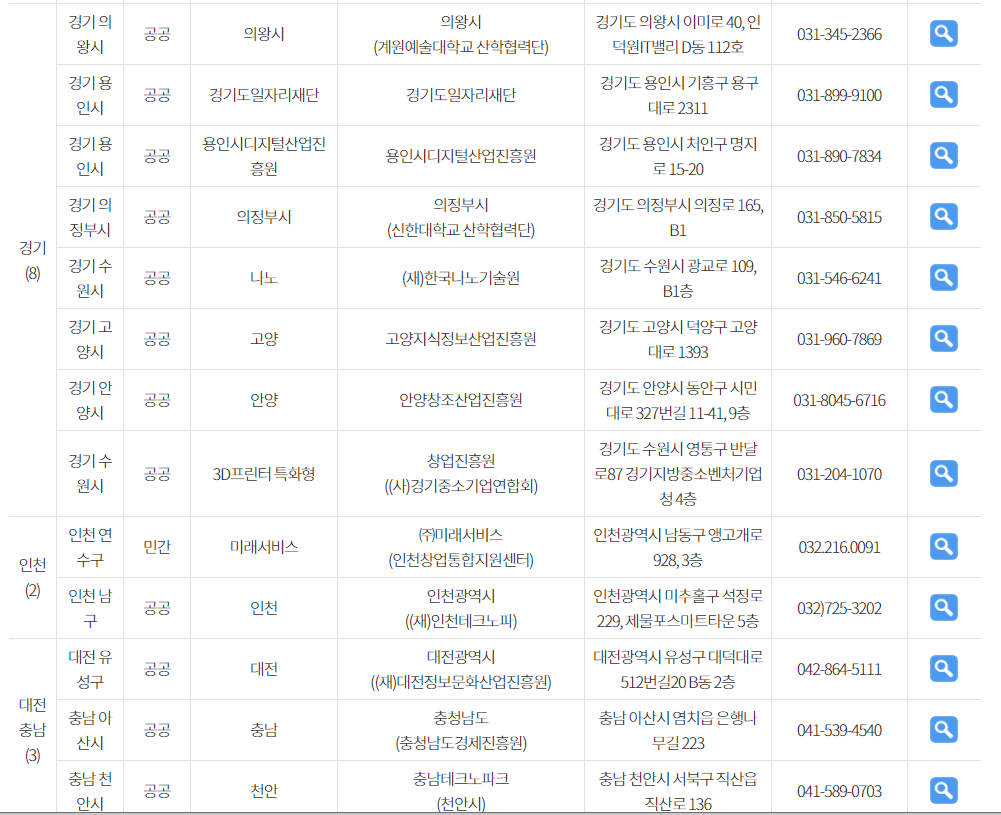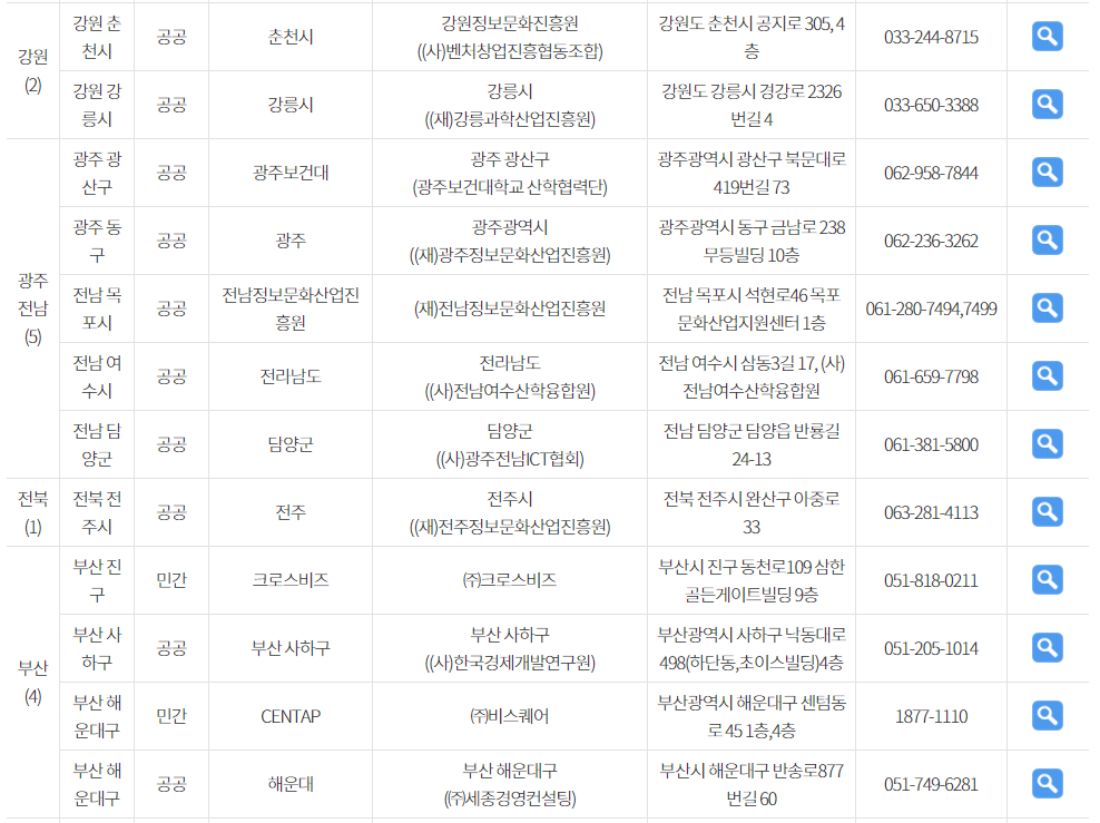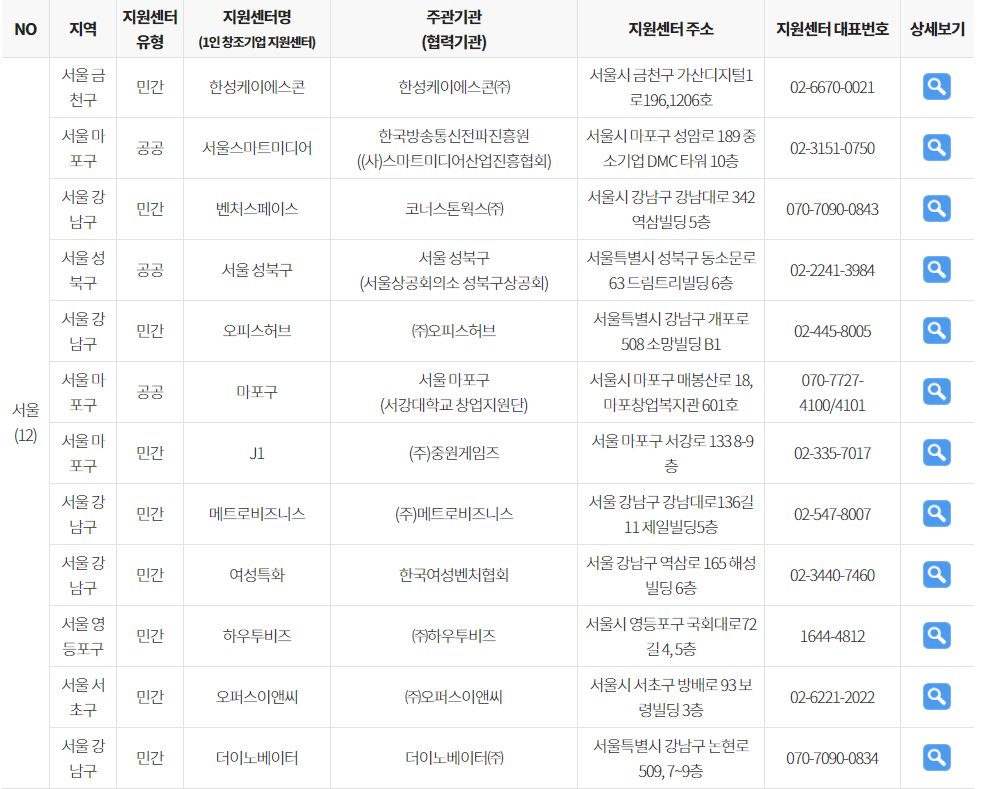 전국의 1인 창조기업 지원센터 현황입니다.