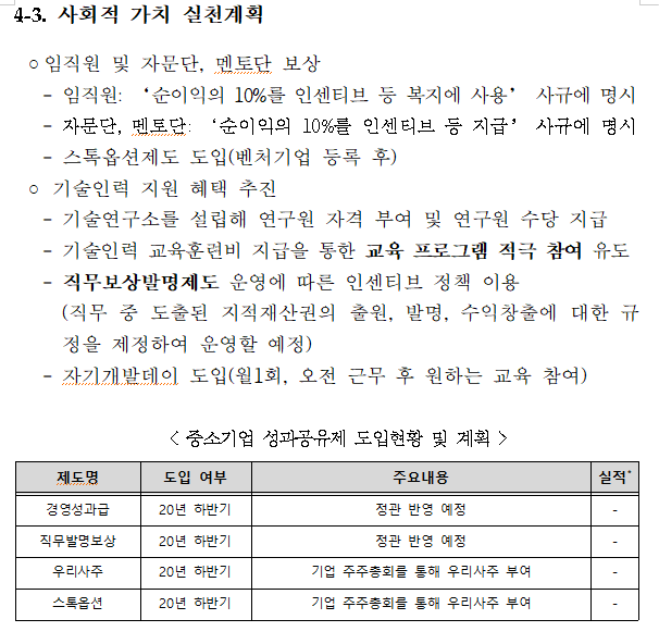마지막으로 작성하셔야 될 파트가 사회적 가치 실천계획입니다. 사업의 성과를 직원들과 공유하고 기술인력에 대한 지원 혜택이 회사 내에 규정화 되어 있는지 여부에 대해서 평가를 합니다. 직무발명보상제도 운영 유무, 스톡옵션제 등 회사 직원들에 대한 복지 혜택 구비 여부에 대해서 판단을 합니다. 저는 이런 제도들을 향후에 도입할 것이라고 계획을 세웠습니다.