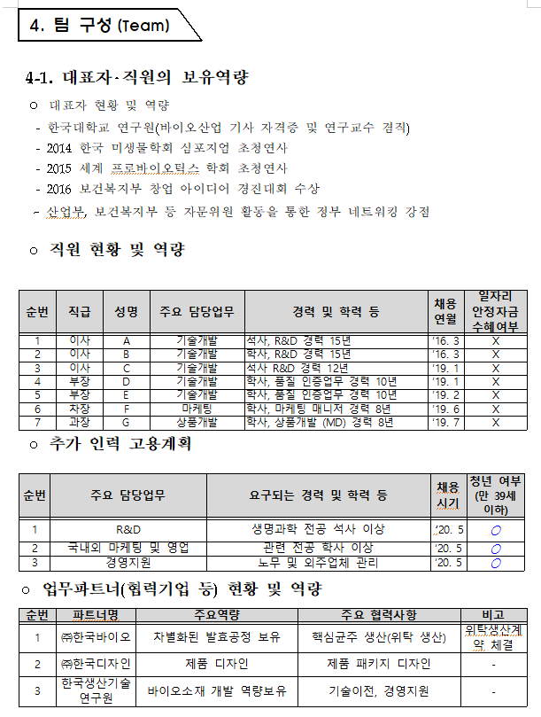 안녕하세요 창업사령관입니다. 우리나라에서 창업기업의 기준이 무엇일까요? 정답은 사업을 개시한 날 부터 7년 미만인 기업을 뜻합니다. (중소기업창업지원법 제1장 2조 참고) 창업 기업의 평가에서 아주 중요한 항목이 바로 대표자 및 핵심 인력입니다. 민간 벤처캐피탈(VC)로 부터 투자를 받을때, 정부지원사업에 기업지원사업을 신청할 때, 정책자금을 신청할 때(중소벤처기업진흥공단, 신용보증기금, 기술보증기금 등) 항상 기업 평가를 받을 때 대표자 및 핵심인력의 역량(주요 경력)이 아주 중요합니다. 당연히 이번 창업도약패키지 사업계획서에도 대표자 및 직원의 보유역량을 적는 파트가 있겠지요.
