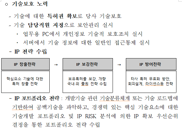 또한 기술보호노력 파트를 서술하는 부분이 있는데, 이 부분이 왜 사업계획서에 포함될까요? 실컷 국가세금 3억원을 지원했더니 해외에 유출되거나 (신문에 가끔 나오죠) 또는 타 회사로부터 쉽게 지원기업의 특허권이 무효화 된다면 정부 지원이 무용지물이 되겠지요. 따라서 이런 위험성을 회피하기 위한 기술보호 노력에 대한 기업의 마인드가 어떤지, 그리고 구체적 전략이 있는지에 대해서 평가 하기를 원합니다. 그래서 기술보호노력에 대한 작성 항목이 들어가 있습니다.