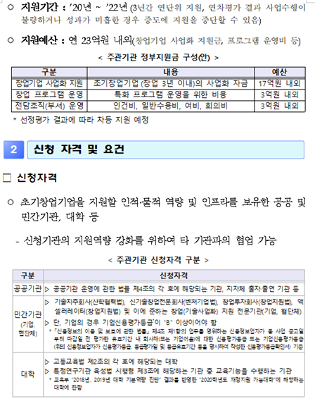 아래는 2020년에 진행된 초기창업패키지 주관기관 모집 공고문입니다.
