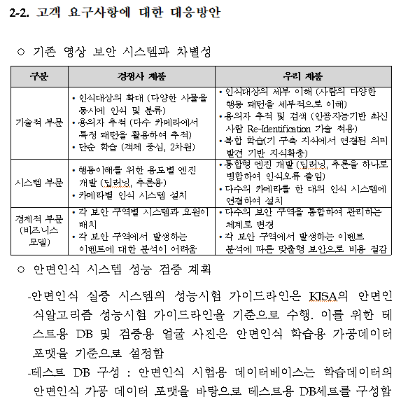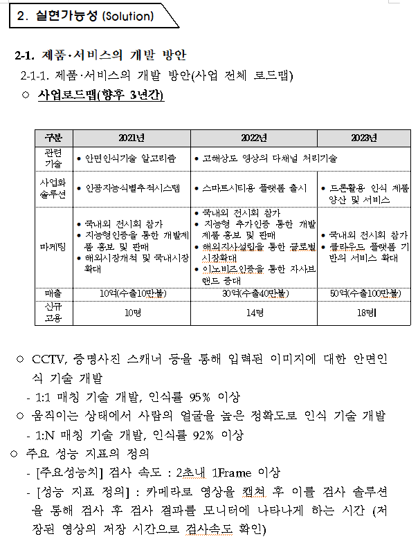 또한 제품 서비스의 개발 방안을 적어야 함으로 제 아이템에서 달성하고자 하는 기술 목표치도 적었습니다. CCTV 상의 영상으로 정확하게 사람을 인식하는 인식률을 1대 1 매칭의 경우는 95% 이상, 1:N 매칭의 경우 92% 이상의 인식률을 확보하겠다고 서술했습니다. 또한 검사 속도의 목표치도 2초 내 1 프레임 이상으로 잡았습니다. 실제 작성 내용은 아래와 같습니다.