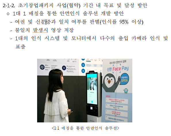 다음은 2-1-2, 초기창업패키지 사업(협약) 기간 내 목표 및 달성 방안 파트입니다. 이 사업을 통해서 2가지 개발 목표를 세웠습니다. (1대 1 매칭을 통한 안면인식 솔루션, 1대 N 매칭을 통한 안면인식 솔루션)