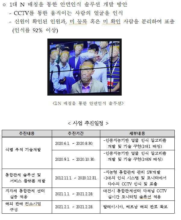 1대 1 매칭을 통한 안면인식 솔루션은 만약 여권 및 신분증과 얼굴이 일치하지 않으면 영상을 저장하고 1대의 인식 시스템 및 모니터에서 다수의 출입 카메라를 통해 인식 및 표출할 수 있습니다. 또한 1대 N 매칭을 통한 안면인식 솔루션은 CCTV를 통해 움직이는 사람의 얼굴을 인식하고 신원이 확인된 인원과, 미등록 혹은 미확인 사람을 분리하여 표출합니다.