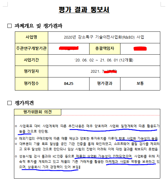 아래 예시는 과학기술정보통신부 산하의 연구개발특구진흥재단의 R&D 과제 결과평가 공문 샘플입니다. 보통 결과 평가 공문에는 평가 점수 및 평가위원들의 의견이 적시되어 있습니다. 평가 의견서(파란색 밑줄)를 보시면 과제를 통해 사업가능성이 높다느니 좋은 의견들로 구성되어 있는 것을 알 수 있습니다. 평가 결과 공문을 기보 담당자 상담시 제출하십시요.