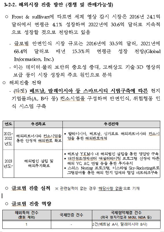 안면인식 아이템으로는 저는 아래와 같이 작성해봤습니다. 국내 시장 규모 및 지자체 통합관제센터를 우선 타기팅(Targeting)해서 판매전략을 짜 봤습니다.