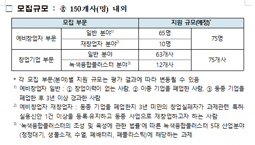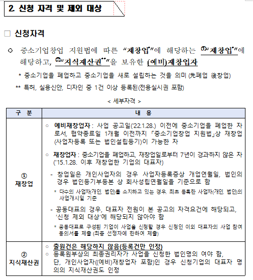 - 아래 모집 부분중 재창업자 부문에서 등록된 특허, 실용신안 1건이 신청 자격 요건이었습니다.