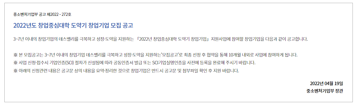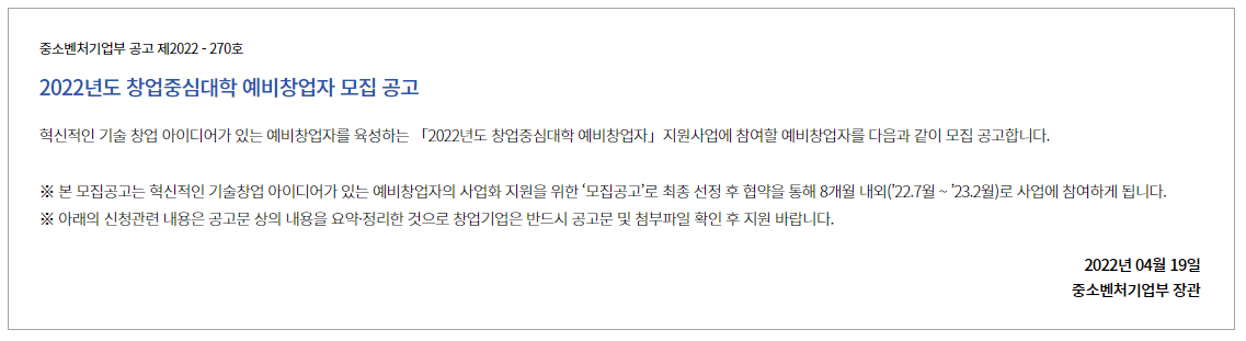 아래와 같이 2022년 상반기에 창업중심대학 지원 사업에 대한 공고가 있었습니다. (예비창업자, 초기창업기업, 도약기업)