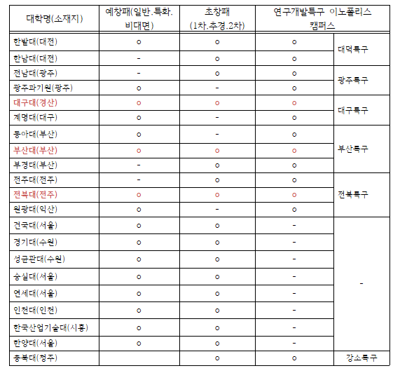2020년 기준으로 중소벤처기업부의 대표적인 창업지원사업인 예비창업패키지, 초기창업패키지 그리고 과기부의 창업지원사업인 연구개발특구 이노폴리스캠퍼스 사업... 이들 3가지 사업을 동시에 수행하고 있는 대학을 빨간색으로 표시했는데 바로 대구대, 부산대, 전북대입니다.