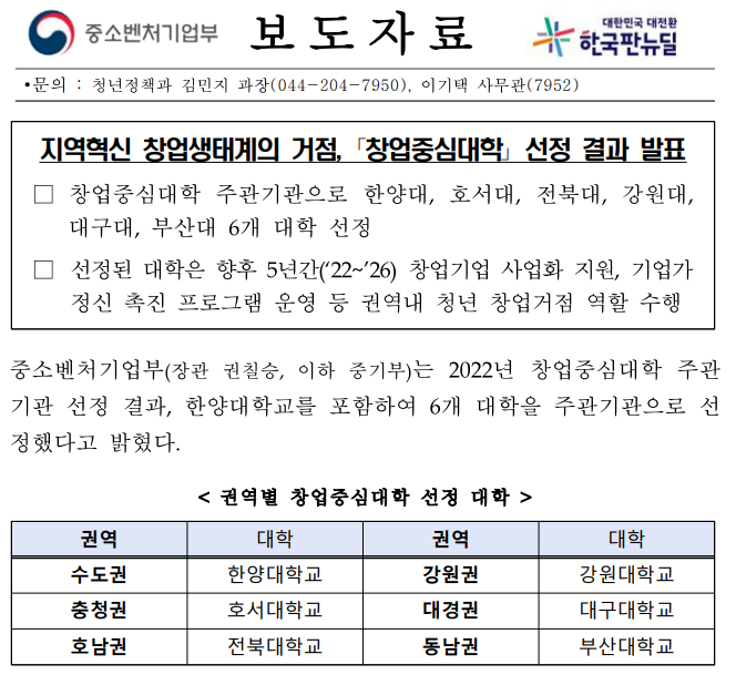 전국 대학들 간에 치열한 경쟁 끝에 6개 대학이 선정되었습니다. 이들 6개 대학은 5년간 매년 최대 75억원 내외의 예산을 지원받게 되었습니다. 한마디로 대박을 쳤습니다. 선정되기 위해서 고생한 대학교 교직원들은 성과급을 두둑이 받으실 자격이 충분합니다. 이들 6개 대학은 중기부의 창업지원사업의 간판 격인 예비창업패키지, 초기창업패키지, 창업도약패키지 사업! 이 3개의 사업을 동시에 수행해서 예비창업자 및 창업기업들을 지원하게 되었습니다.