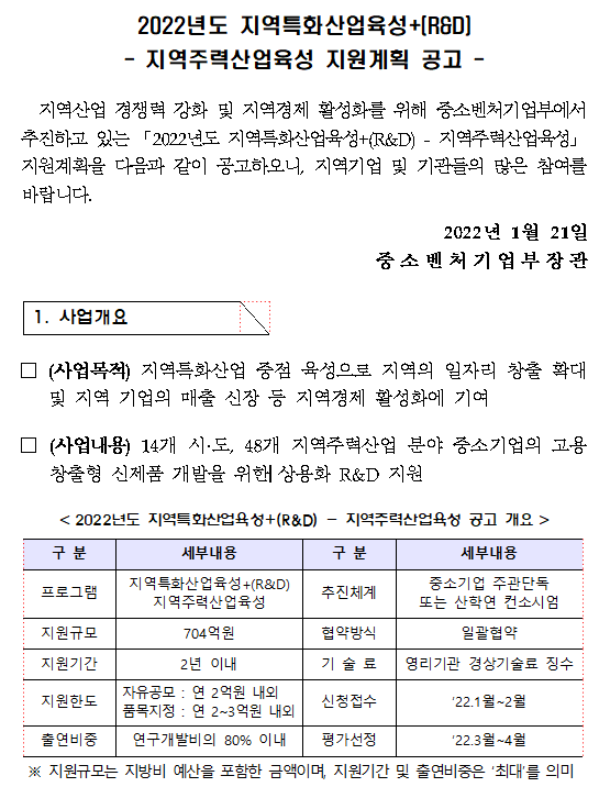 현재 중소벤처기업부에서는 2022년도 지역특화산업육성+(R&D) 내 지역주력산업육성을 공고중에 있습니다. 1990년말~2000년 초반부터 우리나라에서는 지역 균형 발전을 명분으로 수도권(서울, 경기, 인천)을 제외한 지방 기업을 대상으로 지역특화산업육성사업을 별도의 예산으로 지원하고 있으며 창업기업 및 스타트업들이 많은 지원을 받을 수 있습니다.