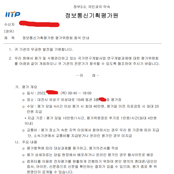 대전에 있는 과학기술정보통신부 기업 지원 및 연구개발 지원 전담기관인 정보통신기획평가원(보통 IITP라고 부릅니다) 지원 사업 평가위원으로 다녀왔습니다. 아래와 같이 참석 안내 공문을 받았습니다.