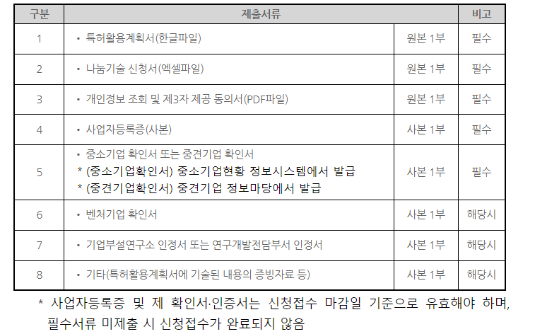 당연히 이전받은 특허를 갖고서 앞으로 기업이 어떤 계획을 갖고 사업화를 시킬 것이냐에 대한 작성 자료가 필요할 겁니다. 바로 특허 활용계획서입니다. 특허 활용 계획서를 잘 쓰셔야겠지요. 진실되게... 제출 서류 8번에 보시면 특허 활용계획서에 기술된 내용의 증빙자료도 첨부하게끔 되어 있습니다.