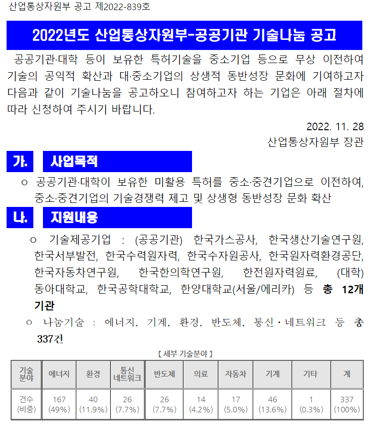 이번 공고문에 무상 이전되는 337개 기술목록 및 기술 세부 내용들도 파일로 첨부되어 있습니다. 저도 블로그에 올리겠습니다.
