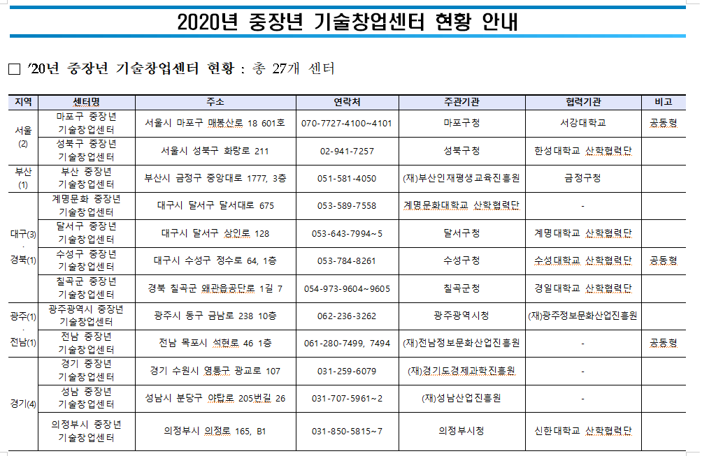 중장년 기술창업센터가 중소벤처기업부 예산으로 전국 27개 센터에서 운영중에 있습니다. 말그대로 중장년 즉 만 40세 이상 예비창업자 또는 창업자가 경력, 네트워크 및 전문성을 활용하여 성공적인 창업을 할 수 있도록 지원합니다. 창업공간을 지원하고 있으며 창업교육 및 퇴직 예정자의 경우 맞춤형 기술창업 교육도 받으실수 있고 멘토 프로그램도 지원받으실 수 있습니다.