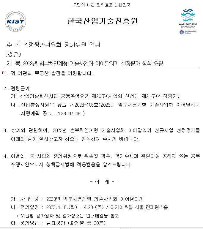 아래와 같이 평가위원 위촉 공문을 받았었네요.