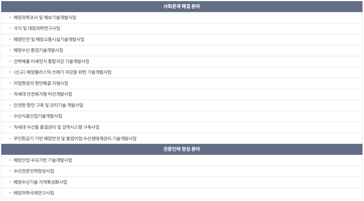 해양 수산 기업과 산업을 육성하기 위한 전담기관입니다. 해양수산과학기술의 지식화, 정보화, 고부가가치화를 위한 다양한 기술지원 서비스를 운영하고 있습니다. 주로 R&D 지원사업을 수행하고 있으며 올해 지원 분야는 크게