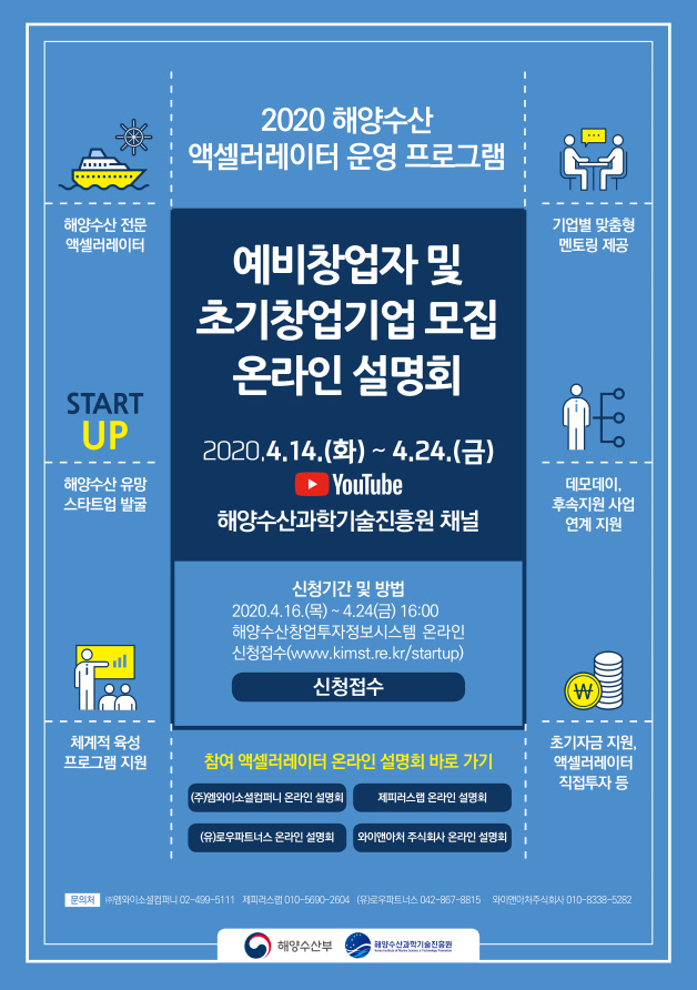 신청 접수 사이트(해양수산창업투자정보시스템)와 각 액셀러레이터들의 지원 프로그램관련 온라인 설명회를 링크합니다. 참고하세요. 아래 해양수산창업투자정보시스템에 들어가시면 각종 창업기업을 위한 자금 및 사업화 지원 내용을 확인하실수 있습니다.