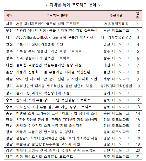 각 지역별 특화 프로젝트는 다음과 같습니다.