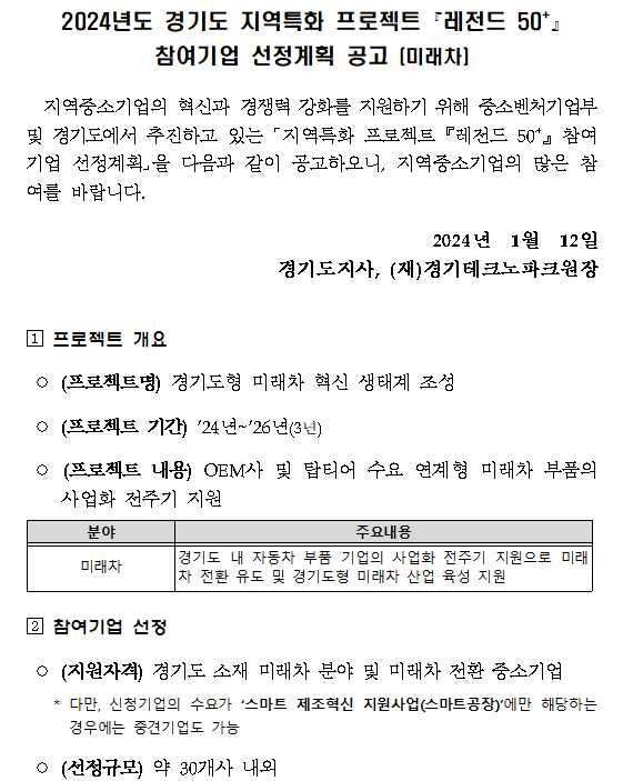 주관기관인 경기테크노파크에서 공고를 했네요. 경기도의 특화 프로젝트가 2개죠. 그중 1개(경기도형 미래차 혁신생태계 조성)를 경기TP에서 주관합니다. 경기TP에서 참여기업 모집 공고를 냈네요.