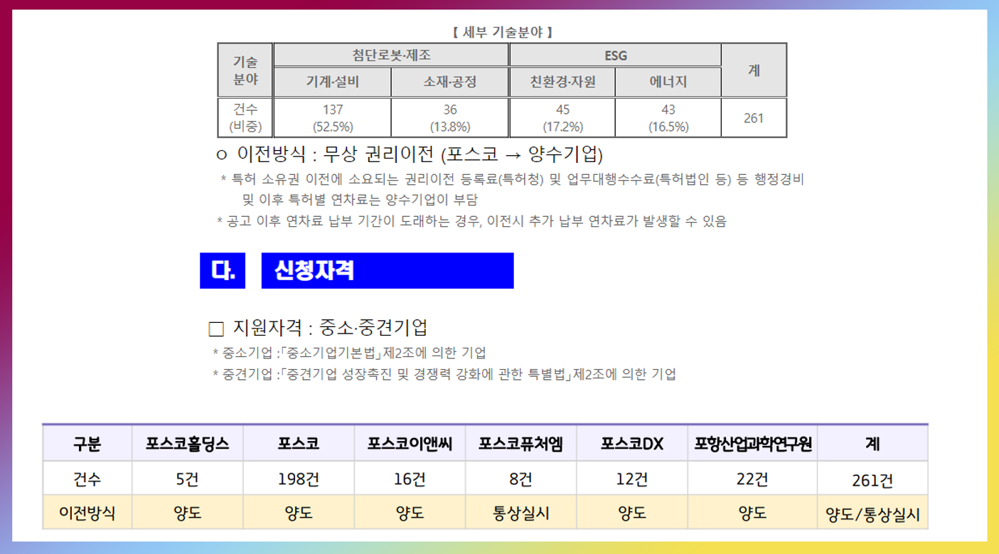 총 261건의 기술들이 무상 권리 이전 대상입니다. 아래 자료를 보시면 포스코 그룹사별 기술 건수도 나와있습니다.