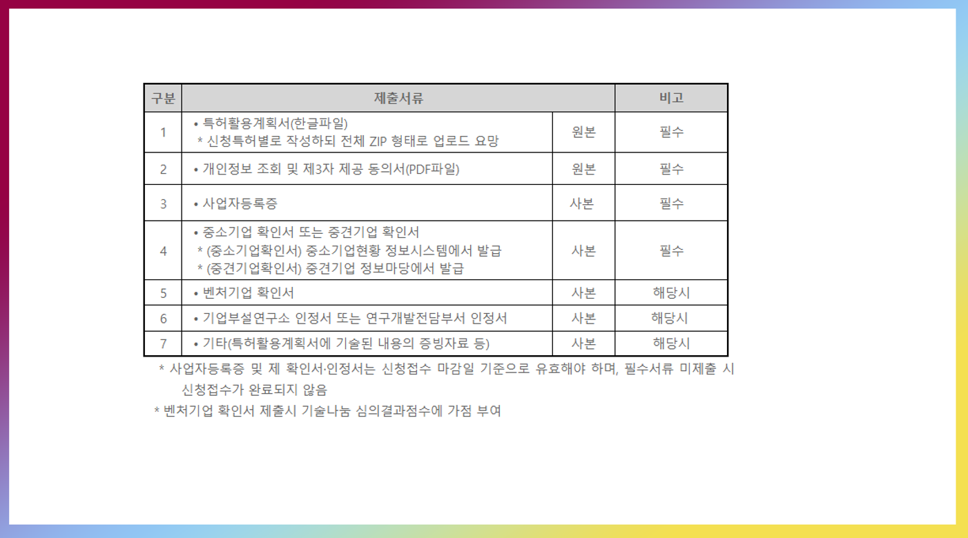 공고문에 첨부된 제출 서류목록입니다. 벤처기업 확인서 제출 시 선정평가에서 가점을 받을 수 있습니다.