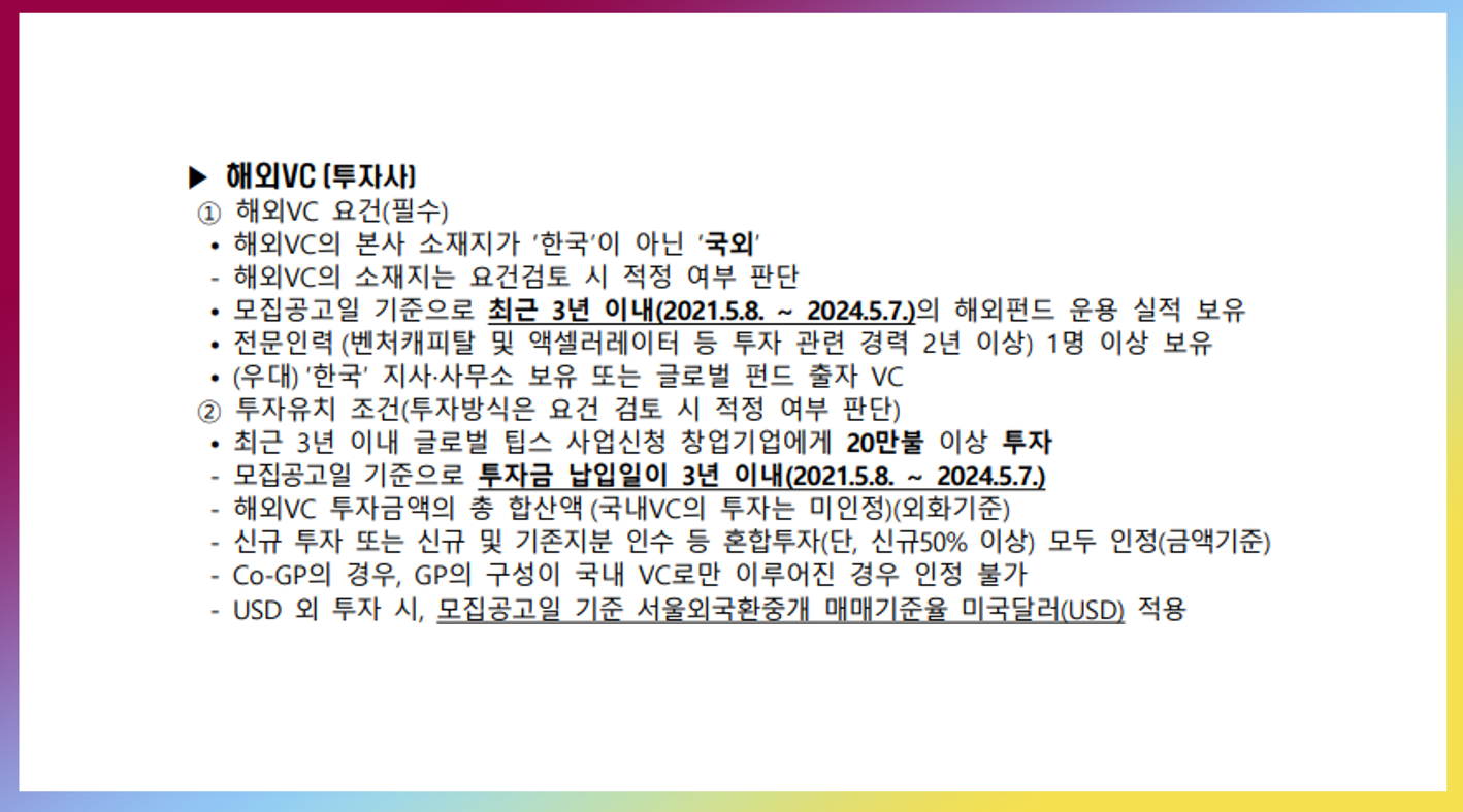 해외 VC(벤처캐피탈)의 요건은 아래와 같습니다. 본사 소재지가 한국이 아닌 국외 여야만 합니다.