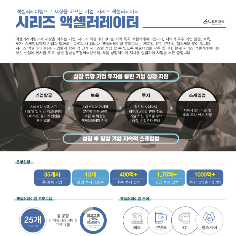 이들 9개 액셀러레이터 외에도 위 사진의 시리즈(CERISE)가 참여했습니다. 대표인 제가 액설러레이터 1곳과 1대 1 컨설팅을 진행했었고 발표평가를 잘 준비할 수 있게 끔 족집게 과외를 받았습니다. ^^