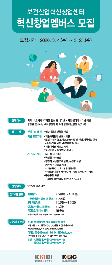 보건산업혁신창업센터 대표 사업으로는 매년 혁신창업멤버스를 모집합니다. 예비창업자 및 초기창업기업(3년 이내) 기업대상으로 모집을 하고 있네요. 아래 모집 포스터를 참고하세요.