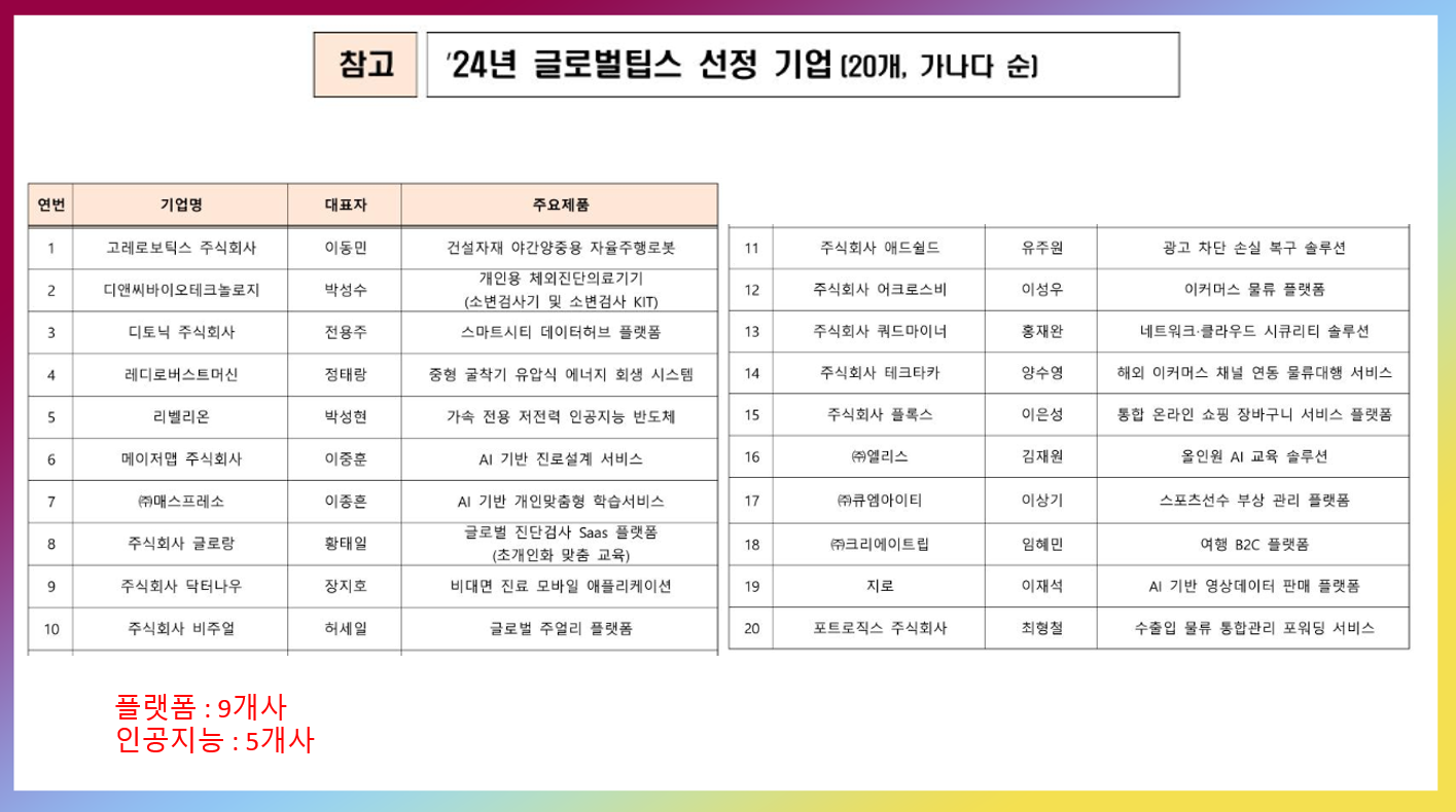 아래는 올해 글로벌팁스 선정 기업 및 주요 제품입니다. 플랫폼 사업이 9개사, 인공지능 분야가 5개사 이네요.