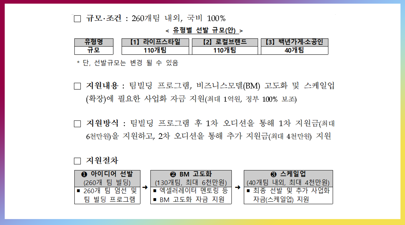 강한소상공인 성장지원사업은 3개의 유형으로 나눠지는데요, 라이프스타일, 로컬브랜드, 백년가게/소공인으로 나뉩니다. 아래 지원 절차를 참고하십시요. 신청을 받아서 아이디어를 선발하고 1차 오디션을 통해 130개팀을 선발합니다. 올해는 공고문 보다 더 뽑았다고 하네요. 1차 오디션 통과 기업에 대해 최대 6천만원을 지원하며 파이널 라운드 최종 오디션 통과 기업에 대해서 4천만원까지 지원합니다.