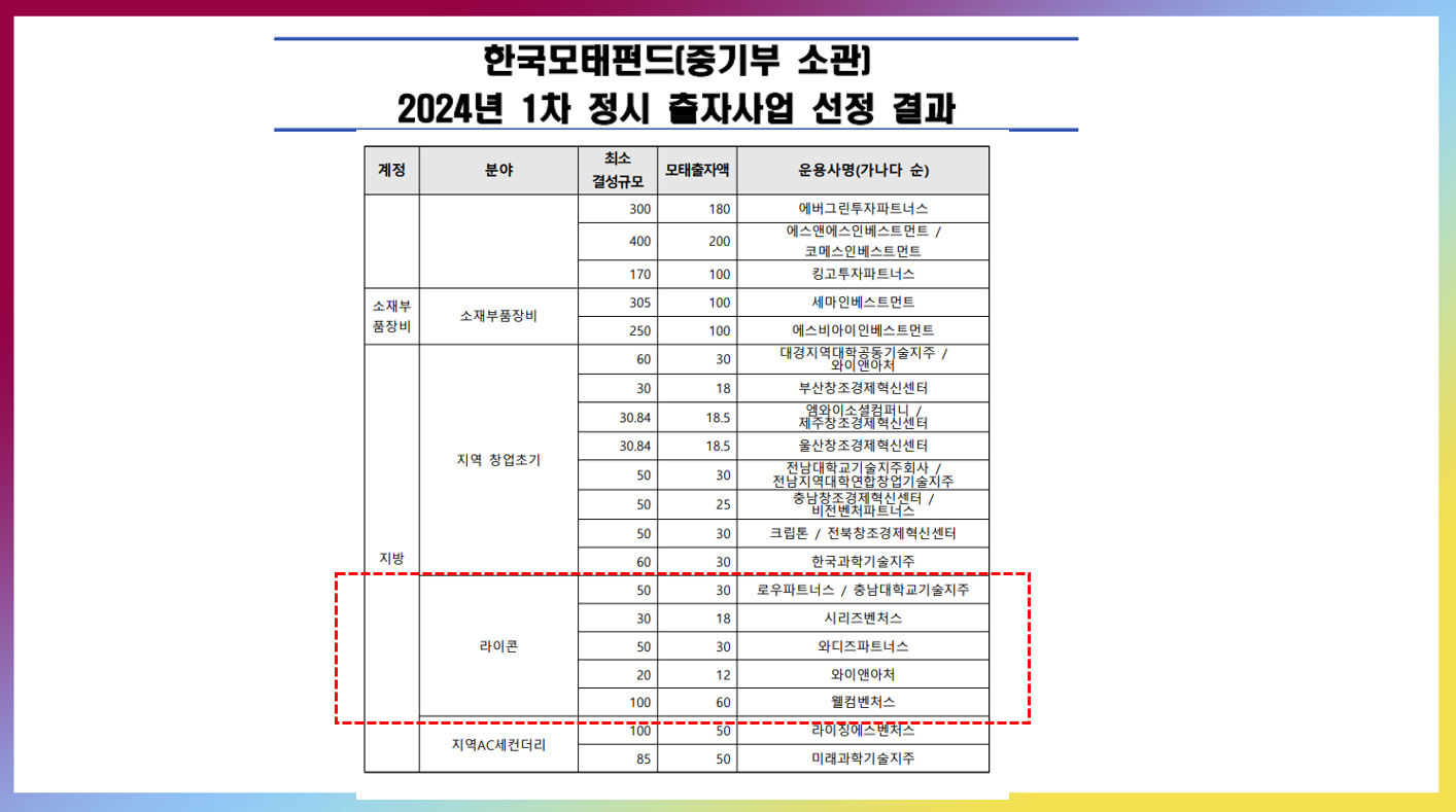 중기부에서 향후 립스 및 라이콘 지원을 강화할 것이라고 살짝 흘린게 있는데요, 바로 모태펀드 계정중에 라이콘 펀드를 올해부터 만들었으며, 펀드 운영사도 아래와 같이 선정했네요. 이들 펀드는 라이콘에 집중 투자를 해야만 합니다.