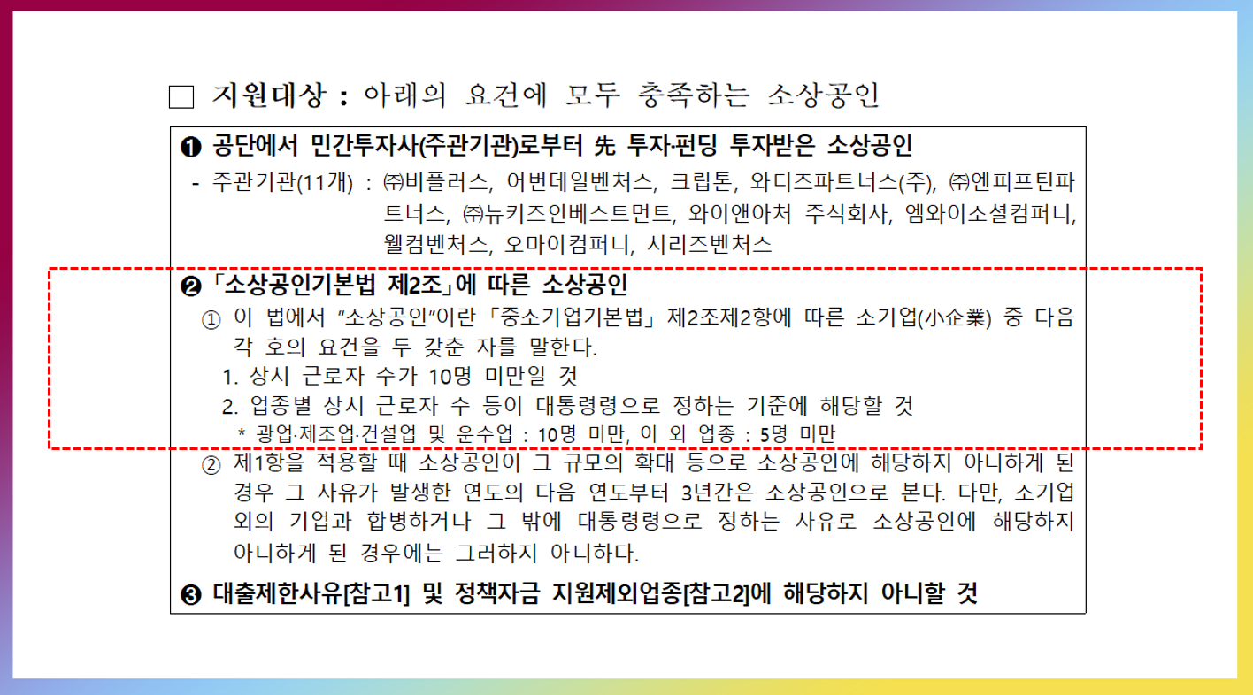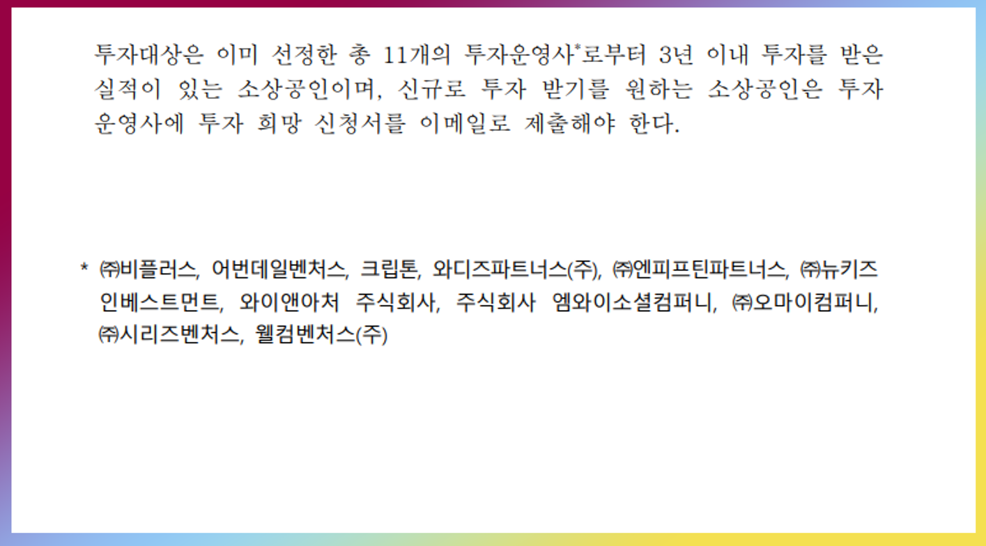투자 유치 금액의 3배(한도 2억원)까지 대출이 아닌 지원금 형식으로 소상공인에게 지원합니다.