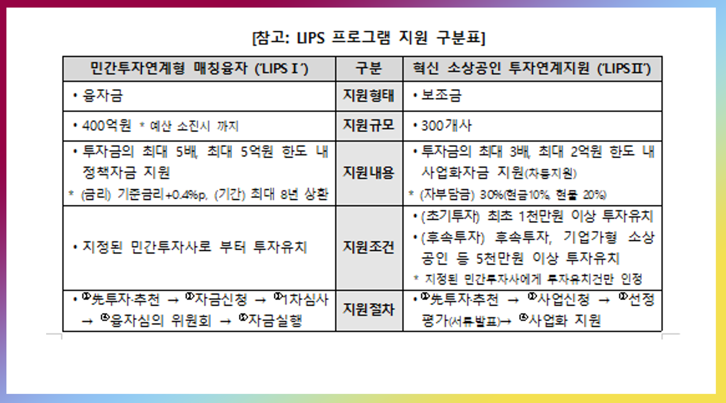 이번 공고에 나온 민간투자연계형 매칭융자(기존 립스)와 이번에 처음 도입된 혁신 소상공인 투자연계지원(립스 2)의 비교표입니다.
