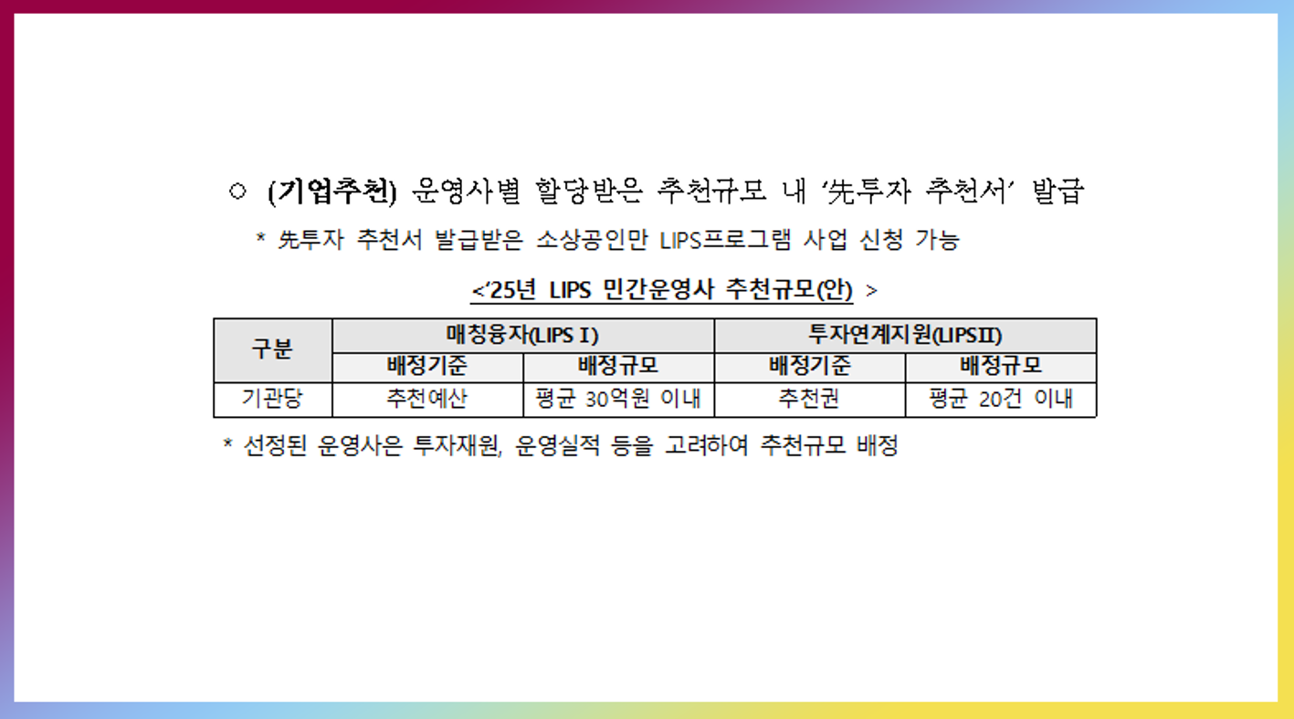민간 운영사 정보가 왜 중요하냐고요? 민간 운영사가 립스 2 사업에 참여할 소상공인을 투자하고 중기부(엄밀히 말하자면 이번에 선정되는 주관기관)에 추천하는 역할을 합니다. 립스2 선정을 위한 첫 관문이죠.