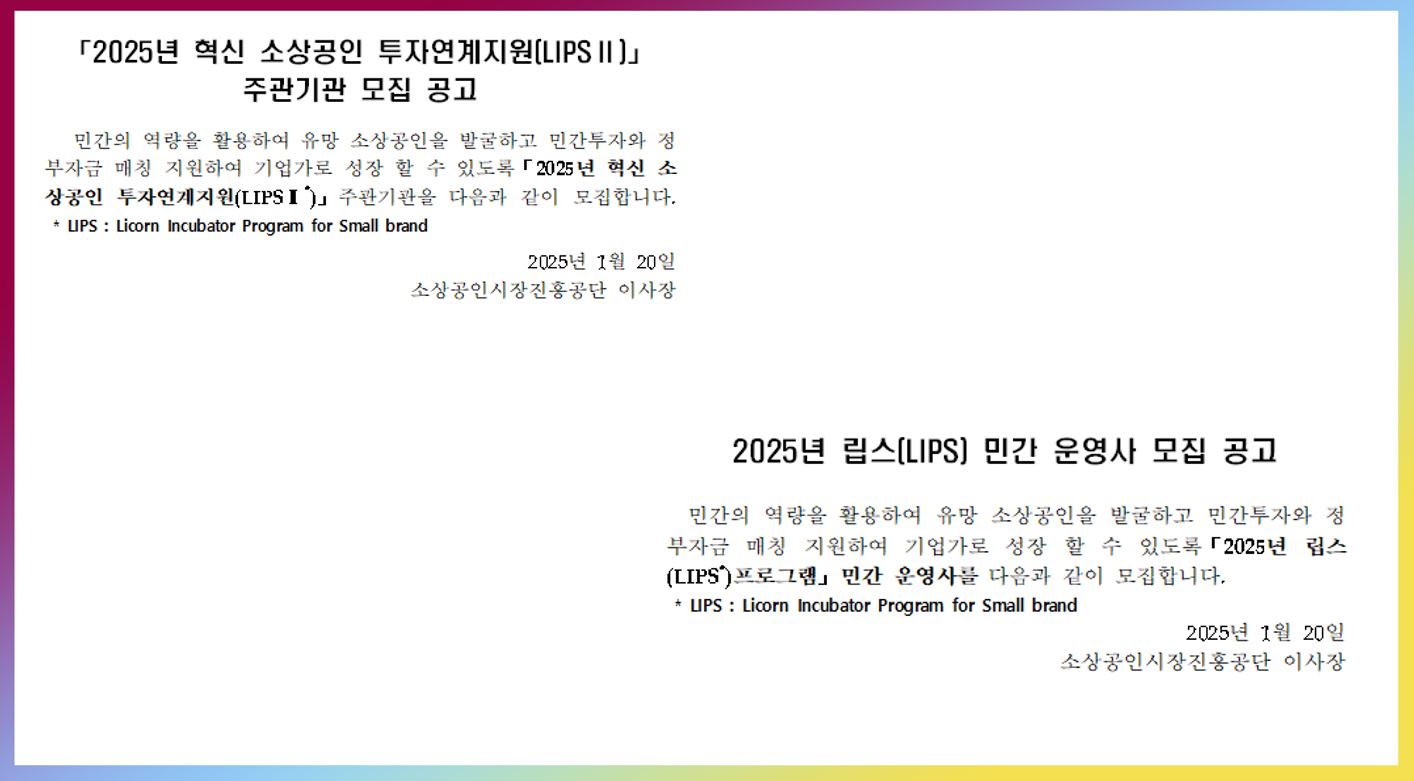 중기부에서 야심 차게 준비해 온 혁신 소상공인 투자연계지원 사업(일명 : 립스2(LIPS II))의 윤곽이 나왔습니다. 우선 사업화 자금을 지원할 소상공인 모집 공고가 아니고(3월 중 공고 예정), 립스 2를 운영할 주관기관 및 민간 운영사(투자사)에 대한 모집 공고가 났는데요, 이들 공고를 통해서 준비 전략을 도출해 봤습니다.