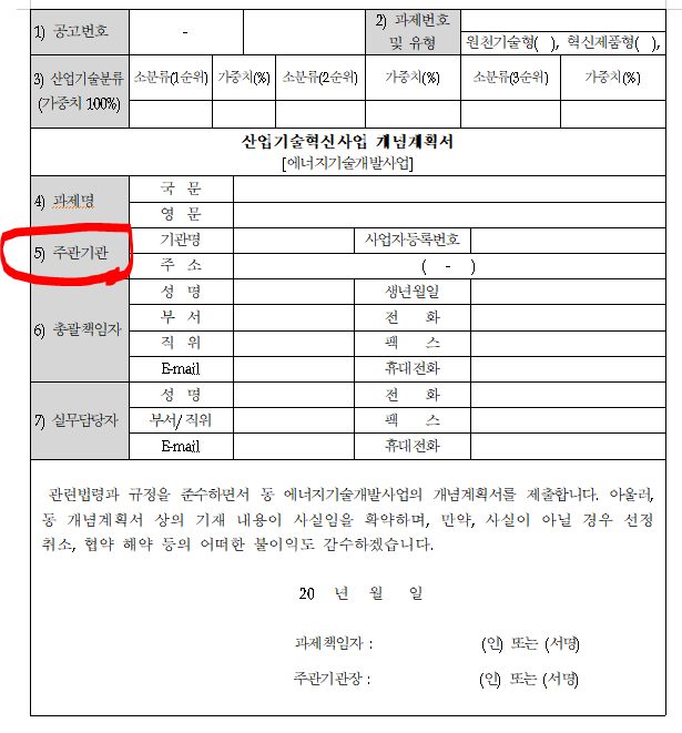 개념계획서는 주관기관 단독으로 신청하는 것이며, 사업계획서는 주관기관과 참여기관들이 컨소시엄을 이루어서 신청하는 것이 차이점 입니다. 아래 개념계획서 표지에는 주관기관 정보만 입력하게 되어 있음을 보실 수 있습니다.