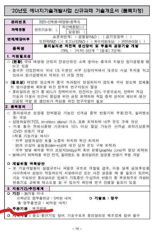 신청 자격 (주관기관, 참여기관 등)을 파악하시려면 품목지정형 과제나 지정공모형 과제 모두 과제제안요구서(기술개요서 또는 RFP)를 살펴보셔야 합니다. 기업이 주관기관을 맡기 위해서는 접수 마감일 현재 법인사업자이어야 하고 사업계획서 평가일 전에 기업부설연구소를 보유하고 있어야 합니다. 보통 주관기관 및 참여기관은 기업, 대학, 연구소 등이 맡을 수 있는데 과제제안요청서에 명시되어 있습니다. 아래 과제제안요구서(품목지정형 과제라서 기술개요서입니다)를 보시면 주관기관에 제한 없음이라고 지정해 줬네요. (빨간색 밑줄 참고)