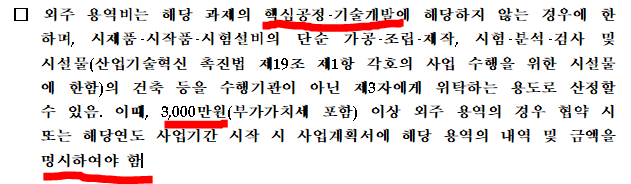 핵심 공정, 기술개발에 해당하지 않을 경우 외주 용역으로 참여하는 방법이 있습니다. 3천만 원 이상의 외주 용역의 경우 사업계획서에 해당 용역의 내용 및 금액을 명시하도록 규정하고 있습니다.
