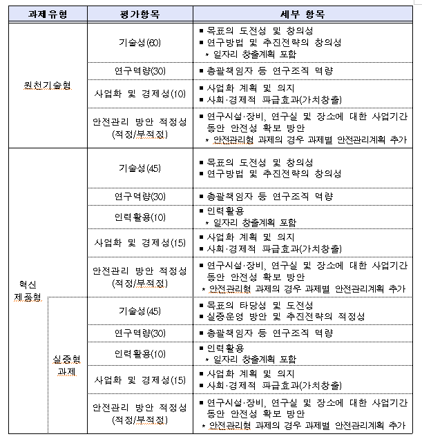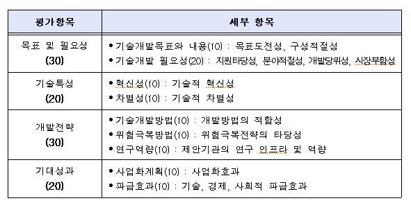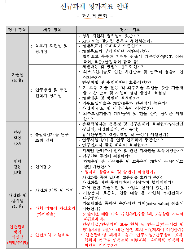 에너지기술개발사업 사업공고문에 보시면 평가 지표가 세세하게 나와 있습니다. 과제 유형상 혁신제품형 과제의 평가지표는 아래와 같습니다.