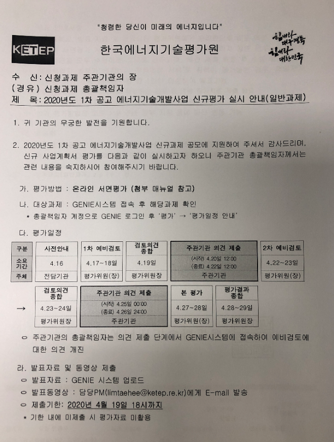 안녕하세요. 창업사령관입니다. 산업부 전담기관인 한국에너지기술평가원의 에너지기술개발사업 사례를 분석해서 연구개발 사업의 진행 프로세스를 설명드리고 있습니다. 바로 이전 글까지 인트로 및 1~4편에 걸쳐서 사업 공고문 분석 강의를 올렸으며, 이번 시간은 사업 신청 후에 진행되는 일련의 평가 절차 및 과정에 대해서 상세히 설명드릴게요. 코로나 여파로 국가 연구개발사업 평가도 비대면 방식으로 바뀌고 있으며 에너지기술개발사업도 그 방향에 맞게 평가 절차가 예년과 달리 바뀌었습니다. 전반적인 흐름을 이해하시면 향후에 연구개발 사업을 준비하실 때도 무엇을 미리 준비해야 하는지와 과제 수주 전략에 대해서 정리가 되실 겁니다.