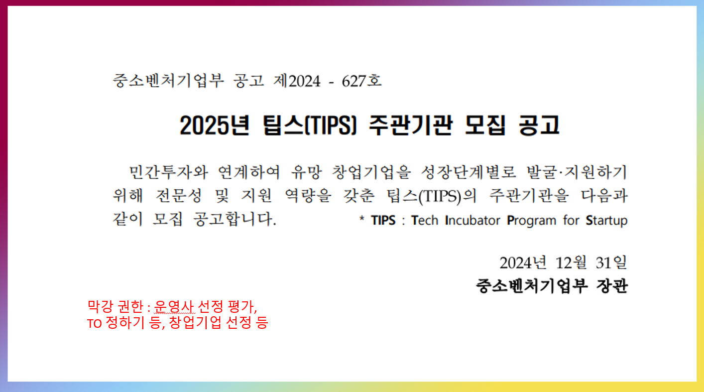 작년 연말에 주관기관 모집공고가 떴었죠. 팁스 주관기관의 권한은 막강합니다. 팁스 운영사 선정부터 팁스 운영사들에게 스타트업 추천권 배분, 그리고 창업기업 선정 평가 권한이 대표적입니다.