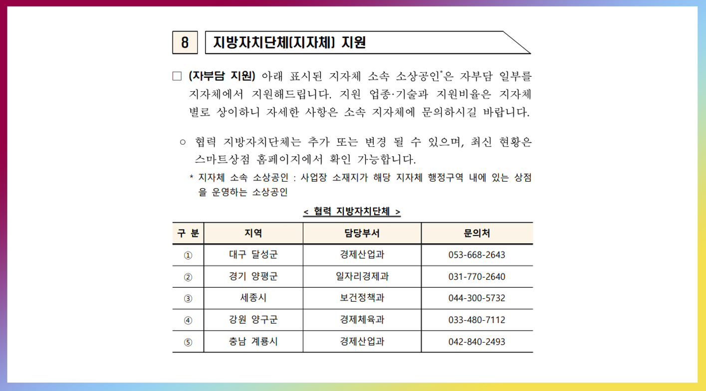 일부 지방자치단체에서는 소상공인의 자부담의 일부를 지원하기도 하는데요, 스마트상점 홈페이지에서 자세한 지자체 리스트를 확인하실 수 있어요. 일단 공고문에는 아래 지자체가 자부담 일부를 지원하네요.
