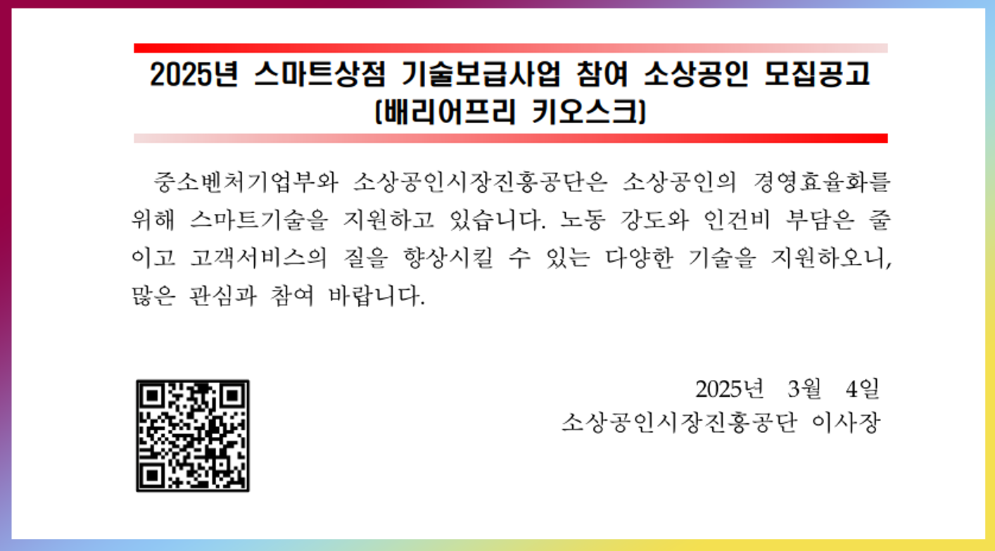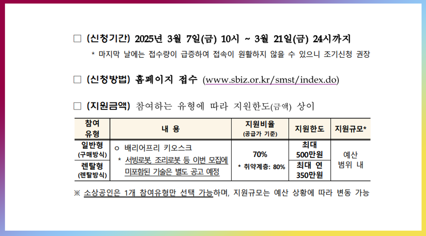이번 공고는 배리어프리 키오스크 품목에 대한 도입 지원이며, 추후 서빙로봇, 조리로봇 등에 관한 공고는 별도로 예정하고 있답니다.